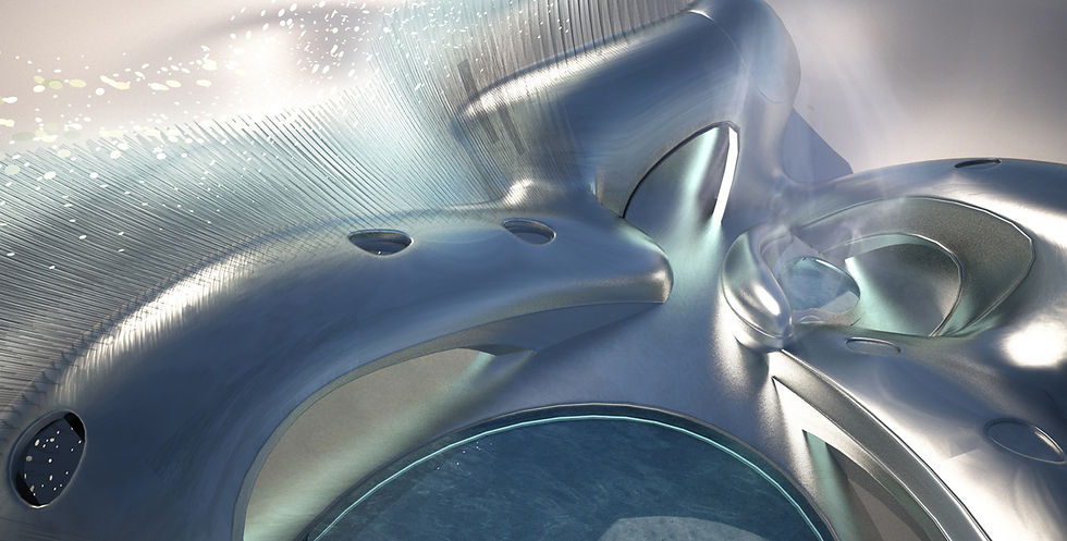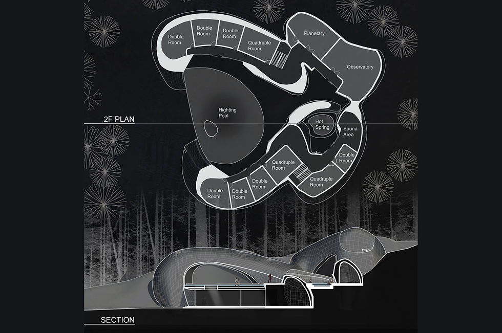 To ensure the building is sufficient and sustainable, geothermal energy is captured to transform into electricity for the generation of a magnetic field. This power is used to generate the magnetic field required to active the façade of the building. The force field allows the LED wings to undulate respond to the Aurora and the force all around. The water collected from snow and rain will be recycled to be used within the building in all leisure hot springs and water features.